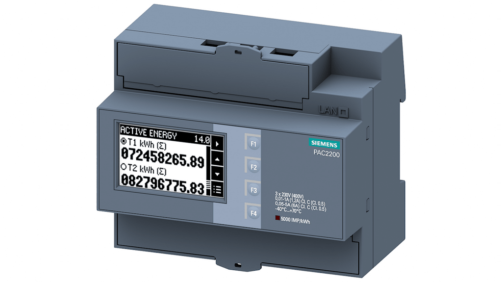 Contatore di energia Siemens, SENTRON PAC2200, 3 fasi, display LCD. Misurazione digitale, tensione nominale fino a 480V, corrente nominale fino a 65A. Interfaccia M-Bus, design compatto per montaggio su guida DIN, profondità 71.4mm, larghezza 107.8mm, altezza 90mm. Certificazioni CE, IEC 61557-12, IEC 62053-22, IEC 62053-23. Software di configurazione gratuito, webserver integrato.