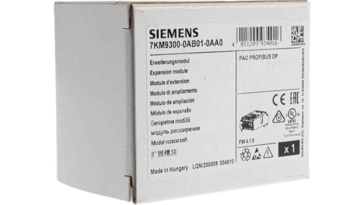 Modulo di espansione Siemens, serie PROFIBUS DP, codice 7KM9300-0AB01-0AA0. Accessori per dispositivo di monitoraggio alimentazione 7KM PAC, tipo accessori, unità di espansione. Include adattatore per montaggio, moduli I/O a innesto, moduli di comunicazione a innesto, trasformatori di corrente diretti. Utilizzato per misurazione e visualizzazione di parametri di rete in distribuzione alimentazione a bassa tensione, compatibile con misurazioni monofase e multifase.