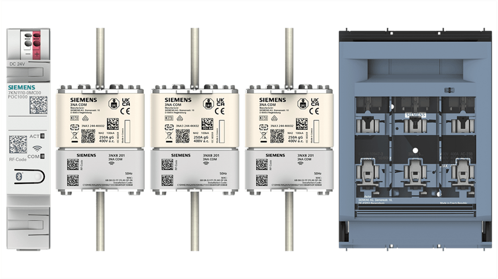Sezionatore portafusibili per guida DIN, corrente massima 400A, 3 poli, fusibili NH1 e NH2, interfaccia Bluetooth wireless, serie SENTRON. Tensione nominale 19.2-28.8V, temperatura operativa da -25 a +60 gradi Celsius, tipo terminale senza viti. Moduli inclusi: 1 modulo 7KN1110-0MC00, 1 modulo 3NP1153-1DA10, 3 moduli 3NA3244-4KK02, 3 moduli 3NX8201. Codice costruttore 7KN11100XC03. Marchio Siemens.