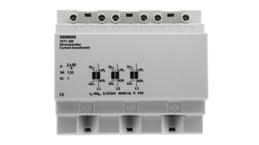 Trasformatore di corrente Siemens, ingresso 60A, uscita 5A, rapporto 60:5, foro 13mm, montaggio a pannello, dimensioni 105 x 71 x 90 mm, tipo passaparete, compatibile con dispositivi di misurazione 7KM PAC per monitoraggio rete bassa tensione. Accessori inclusi: adattatore per montaggio, moduli I/O e comunicazione a innesto. Codice costruttore 7KT1200.