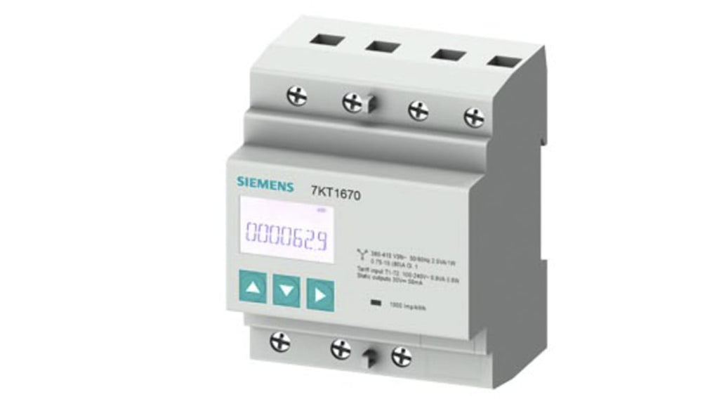 Contatore di energia Siemens, SENTRON PAC1600, dispositivo di misurazione trifase, display LCD, tensione L-L 400 V, tensione L-N 230 V, corrente massima 80 A, alimentazione autonoma, morsetti a vite, intervallo di misurazione 187-400 V ca, temperatura operativa da -25 a +55 gradi Celsius, approvazioni CE, profondità 63 mm, misurazione energia apparente, attiva e reattiva, interfaccia M-Bus.