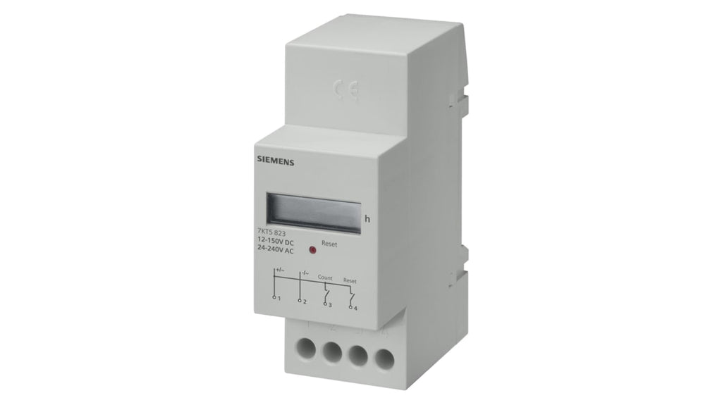 Contatore elettronico per ore Siemens, serie Sentron, tensione di alimentazione 12 a 150 V c.c. e 24 a 240 V c.a., frequenza di conteggio massima 50Hz, display meccanico con 7 cifre, montaggio su guida DIN, metodo di reset elettrico, protezione IP20, certificazione CE, approvazione EAC, UL. Dimensioni compatte, funzione operativa digitale.