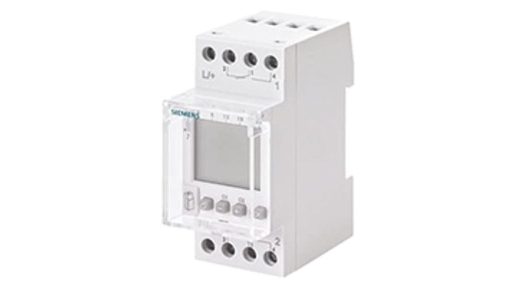 Temporizzatore digitale per guida DIN, 24 V ca/cc, SPDT, 2 canali, programmazione testuale in 15 lingue, programma settimanale, giorni festivi, modalità casuale, contatore ore fino a 65535 h, sincronizzazione 50/60 Hz, funzione ciclica, impostazione automatica ora legale, 56 programmi totali (28 per canale), dimensioni 83 mm x 70 mm. Codice costruttore: 7LF4522-2, marchio: Siemens.