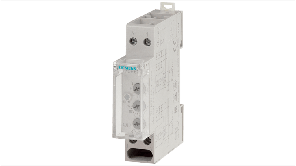 Temporizzatore elettronico per luci scale, 1 contatto NA, tensione di alimentazione 230 V, ingresso multi tensione da 8 a 230 V c.a. c.c., 7 funzioni selezionabili, gamma di impostazione da 0,5 a 12 minuti, collegamento circuito a 3 o 4 fili, preavvertimento di spegnimento lampeggiante, approvato EAC. Codice costruttore 7LF6311, marchio Siemens.