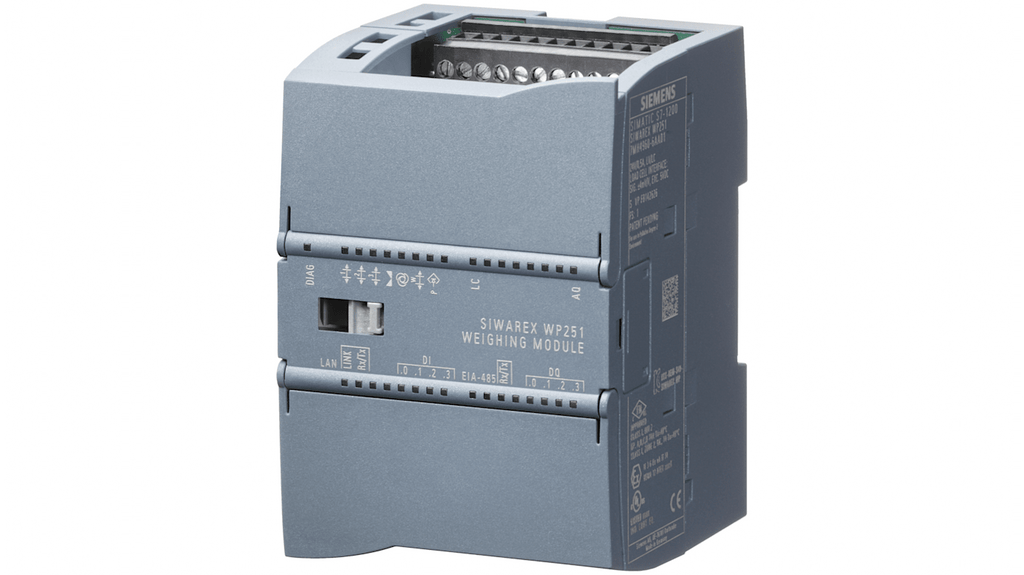 Modulo di pesatura Siemens, serie SIWAREX WP251, per SIMATIC S7-1200, installazione compatta, funzionamento autonomo senza CPU SIMATIC, configurazione con TIA Portal, tecnologia di progettazione uniforme, comunicazione costante, collegamento diretto di pannello di comando tramite Ethernet, quattro ingressi e uscite digitali, un'uscita analogica. Codice costruttore 7MH4960-6AA01.