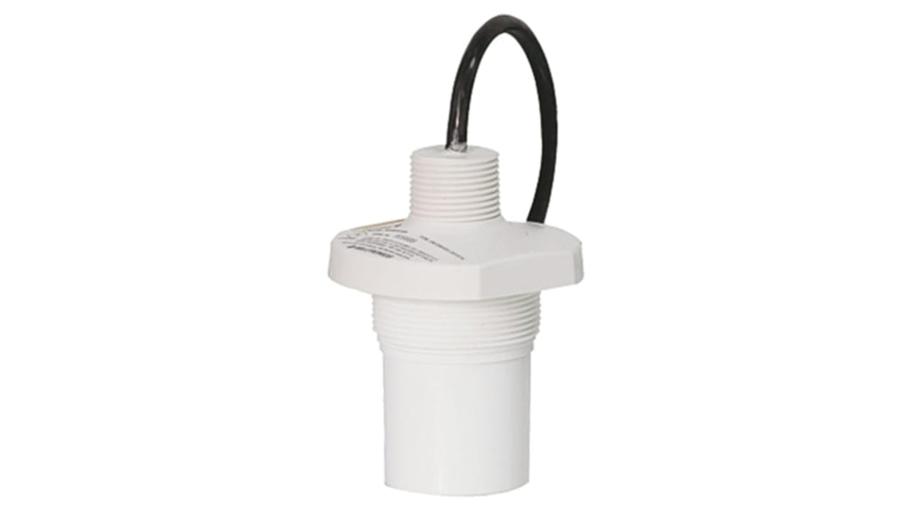 Sensore di livello a ultrasuoni. Trasduttore Echomax, grado di protezione IP68, contenitore ETFE, frequenza 44 kHz, apertura del fascio 12°, intervallo di misurazione 0,3 m a 10 m, compensazione della temperatura interna, autopulente, adatto per ambienti difficili e corrosivi, installazione in montante da 2 poll, temperatura operativa da -40 a +60 gradi Celsius.