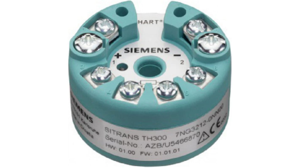 Trasmettitore di temperatura Siemens, ingresso PT100, tensione di alimentazione 11 a 35 V dc, intervallo di misurazione da -40 a +85 gradi Celsius, diametro 44 mm, profondità 26.3 mm, serie SITRANS TH300, segnale di uscita c.c. 4-20 mA, indicatori LED per stato, isolamento elettrico, montaggio nella testa del sensore.