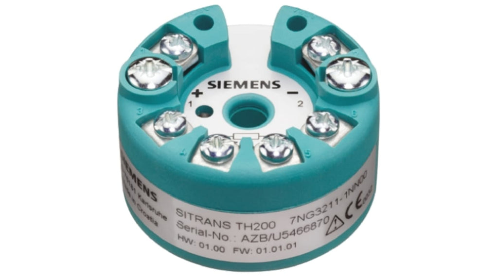 Trasmettitore di temperatura Siemens SITRANS TH200, ingresso PT100, alimentazione 11 a 35 V dc, intervallo di misurazione da 0 a 100 °C, circuito a 3 fili, diametro 44 mm, profondità 26.3 mm, temperatura operativa da -40 a +85 °C. Codice costruttore 7NG3212-0NN00.