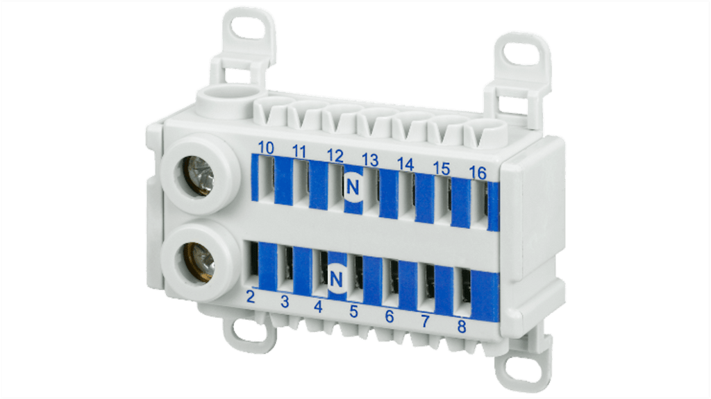 Terminali di collegamento Siemens per ALPHA 400-ZS, 14 poli, dimensione 2x 14 mm2 per morsetti a vite, 14x 4 mm2 per terminali a innesto, installazione orizzontale o verticale su guida DIN, colore blu, peso netto 50 g. Accessori per gamma Alpha. Codice costruttore 8GS4034-1.
