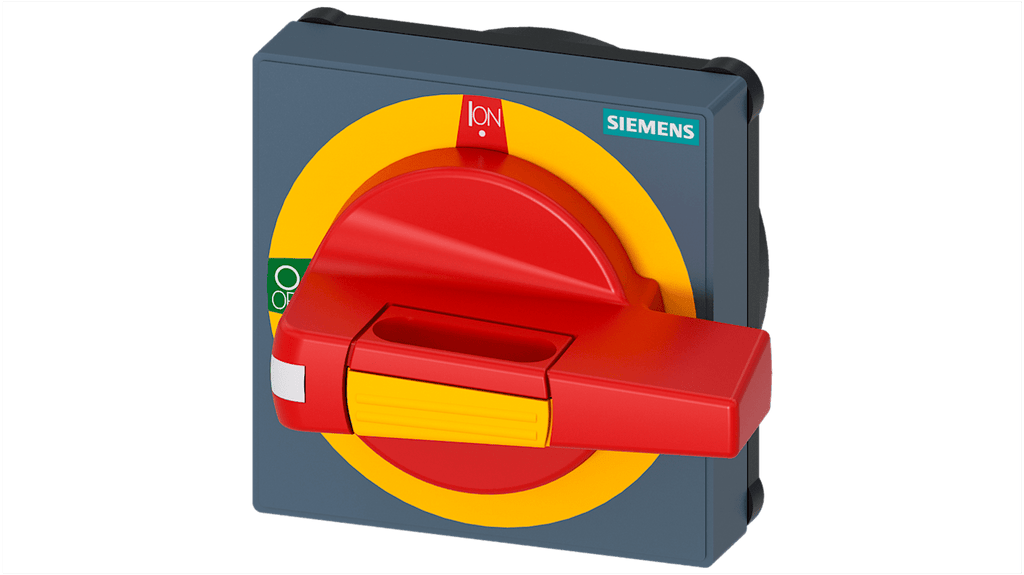 Manopola rotante per spegnimento di emergenza, dimensioni manico 45 mm, colore rosso/giallo, grado di protezione IP65. Compatibile con accessori per 3KD misura 1 e 2, 3KF misura 1. Serie SENTRON, dimensioni di illuminazione 75 x 75, albero 8 x 8. Codice costruttore 8UD1771-2CD05, marchio Siemens.