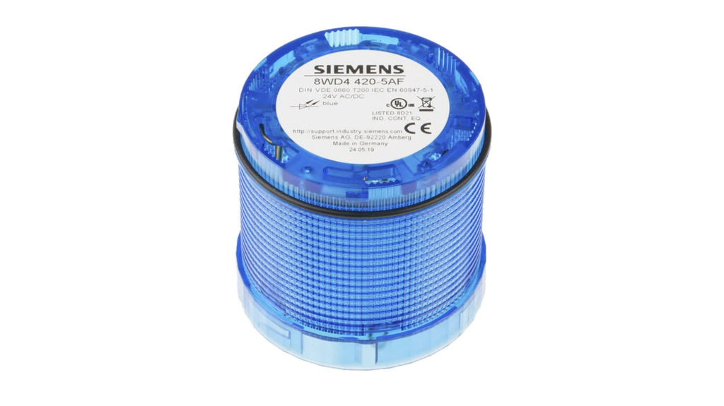 Elemento luminoso lampeggiante Siemens, LED blu, 24 V ca/cc, montaggio a baionetta, diametro base 70 mm, altezza 65.5 mm, temperatura operativa -20 °C a +50 °C, grado di protezione IP65, approvazione UL, certificazione CE, conforme a DIN EN 61346-2 e DIN EN 81346-2. Codice costruttore 8WD4420-5AF.