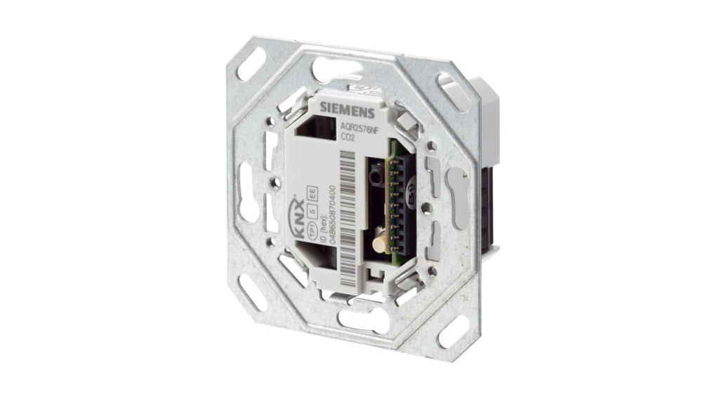 Sensore ambiente con montaggio a filo, Siemens AQR2570NF. Multisensore per temperatura, umidità e concentrazione di CO, intervallo da 0 a 50 gradi Celsius, umidità relativa da 0 a 95%, concentrazione di CO fino a 5000 ppm. Indicazione qualità aria tramite LED, regolatore temperatura ambiente PID, 2 ingressi binari per contatti a potenziale zero, ingresso per sensore di temperatura passivo aggiuntivo. Dimensioni 70.8 mm x 70.8 mm.