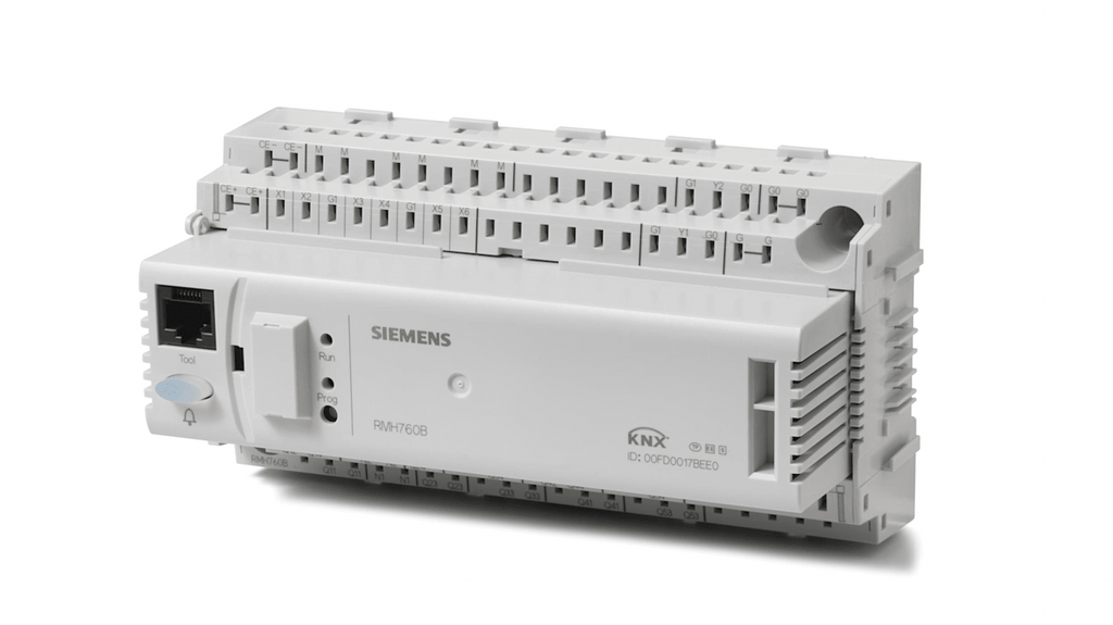 Controllore Siemens serie BPZ, 6 ingressi, 7 uscite, tensione di alimentazione 24 V CA, corrente di uscita 1 mA, montaggio a parete, lunghezza cavo 300 m, massima temperatura operativa +70°C, dimensioni 173 x 80 x 90 mm, collegamento bus KNX, compatibile con sistemi di riscaldamento autonomi e teleriscaldamento, ideale per edifici di medie e grandi dimensioni.