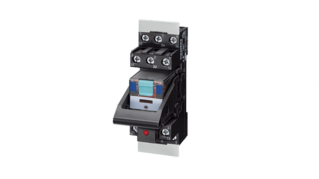 Relè a innesto Siemens, bobina 24V ca, potenza 2 W, corrente di commutazione 4A, connettore femmina rosso con isolamento logico, terminale a molla, vita utile meccanica 30000000 cicli, classe di protezione IP20, montaggio su guida a innesto, non bistabile.