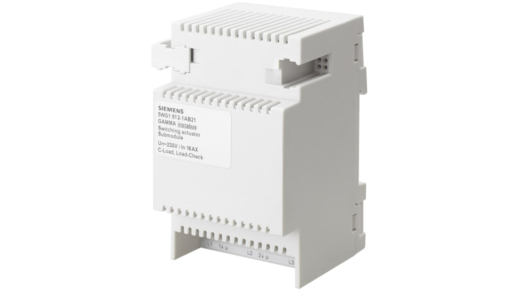 Adattatore per Gamma Instabus, sottomodulo attuatore di commutazione, 3 uscite di commutazione con contatti a relè per 230/400 V AC, 16 A, controllo del carico su ciascuna uscita, montaggio su guida DIN, collegabile in serie con fino a 4 sottomoduli, interfaccia a 6 poli per alimentazione, progettato per applicazioni di controllo dell'illuminazione e ventilazione.