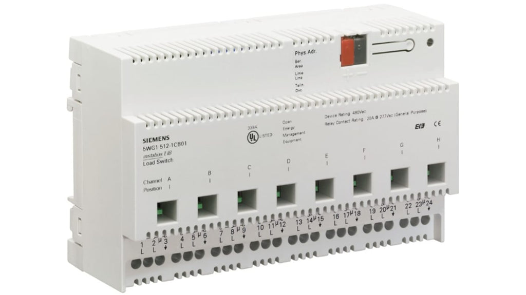 Interruttore di carico per pannello di controllo dell'illuminazione Instabus EIB, 8 uscite da 20A, relè bistabili, tensione di alimentazione 480 V c.a., funzioni logiche programmabili, funzionamento manuale tramite interruttori a scorrimento, modalità on/off-delay e normale/timer, montaggio su guida DIN, involucro in polimero, certificato UL, CSA, CE, KNX/EIB.