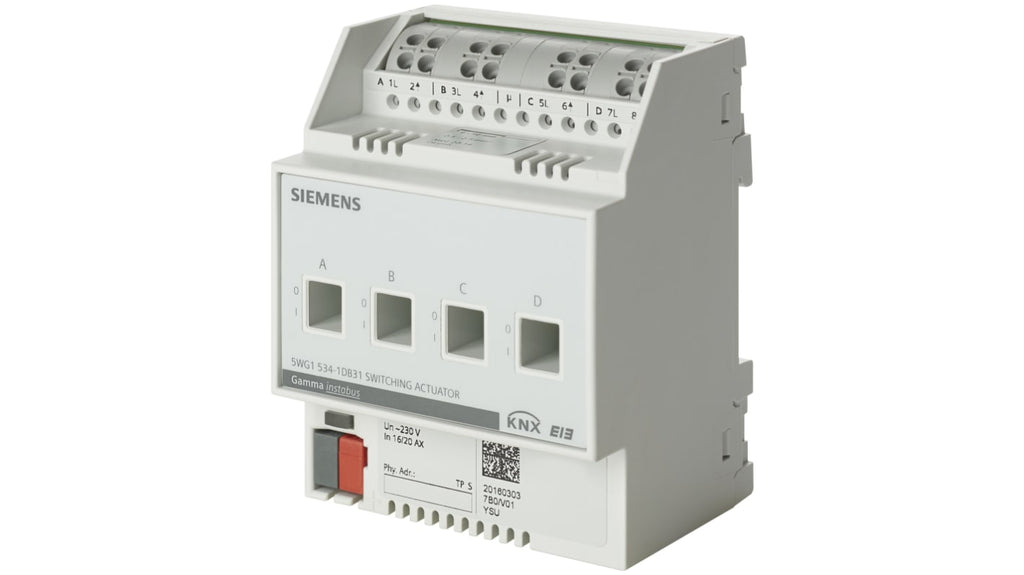 Attuatore di commutazione Siemens, serie N 532, codice N 532D31, per carichi capacitivi, induttivi e resistivi. Morsetti esenti da manutenzione, tensione di alimentazione 230 V c.a., 4 uscite con contatto relè bistabile. Funzioni di controllo avanzate, inclusi messaggio di stato, commutazione temporizzata e modalità notturna. Funzioni di override e diagnostica per conteggio cicli e ore di funzionamento. Compatibile con software Engineering Tool.