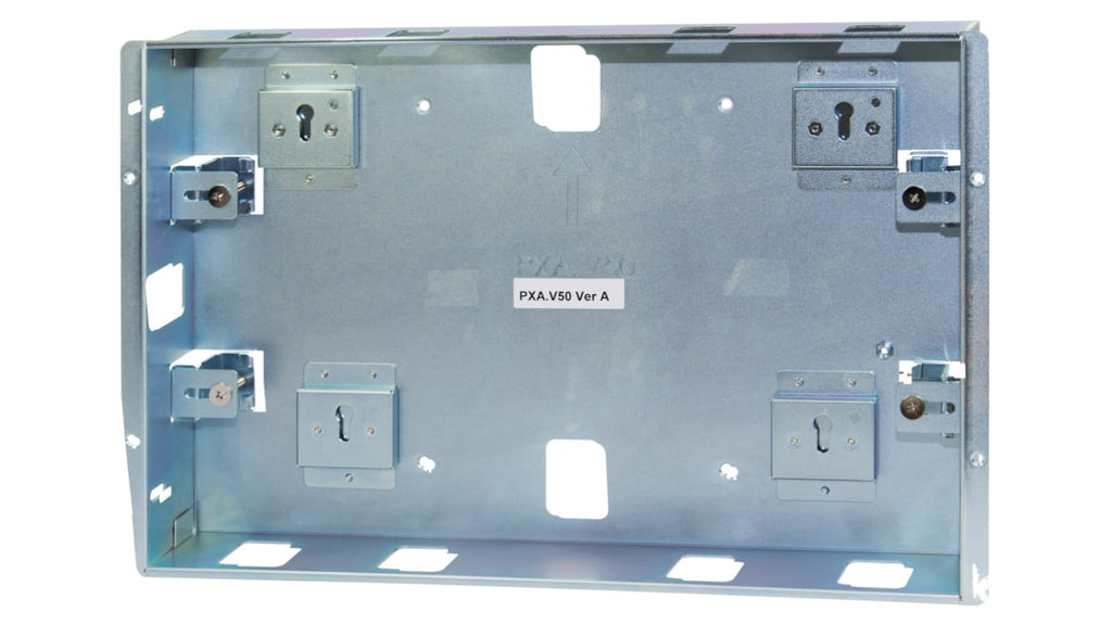 Accessorio per montaggio a parete Siemens, serie PXA, per PXM50-1. Telaio in acciaio zincato, design a incasso, installazione sicura e durevole, compatibile con client touch panel PXM50-1, facile da installare in vari ambienti, ideale per applicazioni commerciali e industriali.