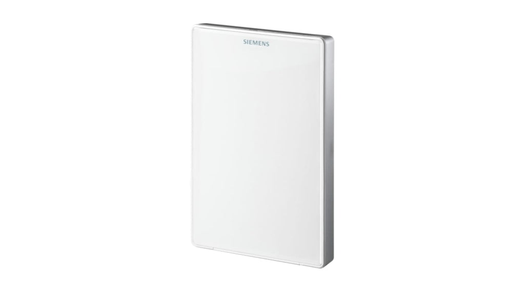 Sensore di temperatura Siemens, progettato per controllori serie DXR, letture da 32 a 122 gradi Fahrenheit con precisione di 0,36 gradi, tasti a sfioramento configurabili, protocolli PL-Link per comunicazione integrata, installazione su scatola elettrica standard 2x4 pollici, gestione energetica attiva Green Leaf, dimensioni 133,4 mm di altezza e 88,4 mm di lunghezza.