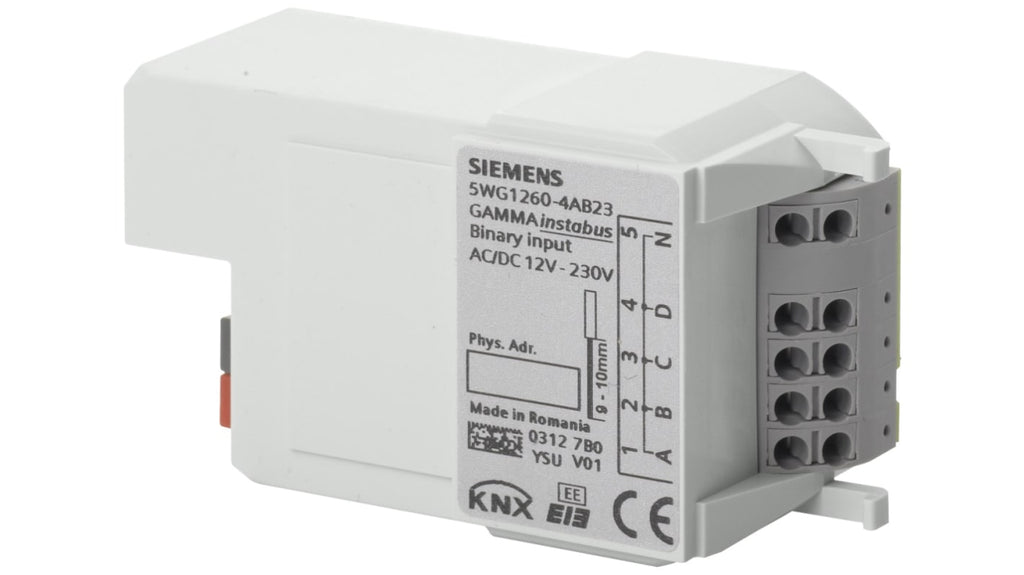 Modulo di ingresso binario per sistema bus KNX, quattro canali di ingresso, monitoraggio tensioni, registrazione stati circuiti, conteggio impulsi, valore in virgola mobile a 16 bit, conteggio impulsi a 8 bit con controllo di soglia, supporta funzioni applicative come regolazione luminosità e controllo protezione solare, alloggiamento in plastica per installazione su guida DIN, alimentazione 24 V c.c., collegamento tramite terminali senza viti.