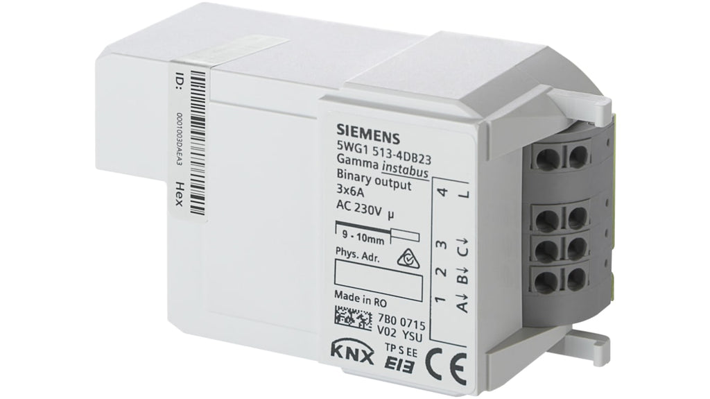Modulo di uscita per commutazione, tre uscite relè, compatibile con scatola di controllo AP 118 e AP 641, tensione di alimentazione 24 V c.c., morsetti senza viti per cablaggio facilitato, conteggio ore di funzionamento e cicli di carico, controllo di scena integrato a 8 bit, configurazione ETS supportata, applicazioni versatili in illuminazione e altri carichi. Marchio Siemens, serie RL 513, codice RL 513D23.