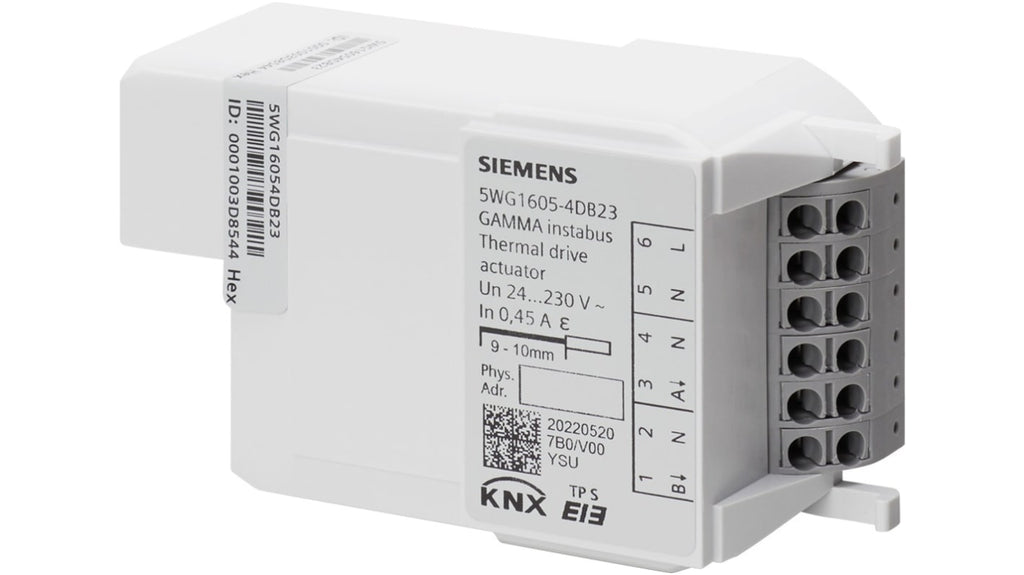 Attuatore termico per il controllo di attuatori elettrotermici in sistemi di riscaldamento o raffreddamento, 2 uscite a semiconduttore, tensione di alimentazione 230 V CA, installazione in scatole di moduli di automazione AP 118 o AP 641, morsetti esenti da manutenzione, controllo prioritario delle funzioni di sicurezza, lavaggio automatico delle valvole, interazione con sistemi primari per riscaldamento o raffreddamento. Codice costruttore RL 605D23, marchio Siemens.
