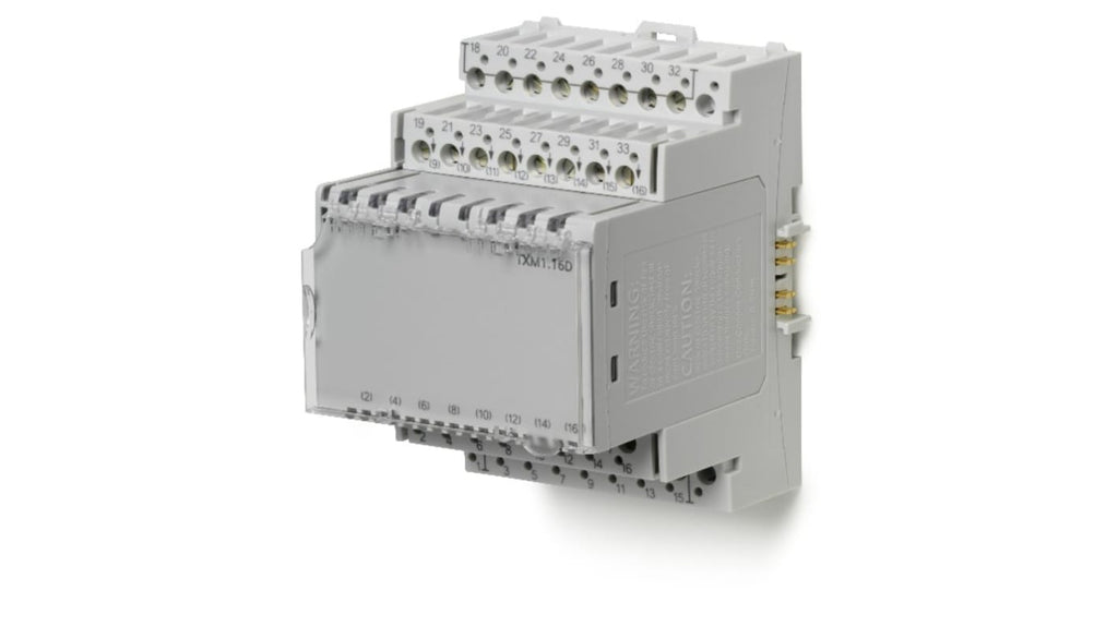 Modulo di ingresso digitale per automazione e controllo, serie TXM1.16D, Siemens. 16 ingressi digitali configurabili individualmente, tensione di alimentazione 24 V c.c., formato DIN compatto per installazione salvaspazio, gestione tramite base morsettiera separata, collegamento diretto ai dispositivi di campo, LED di stato I/O per visualizzazione semplice, etichette su entrambi i lati per identificazione punti I/O.