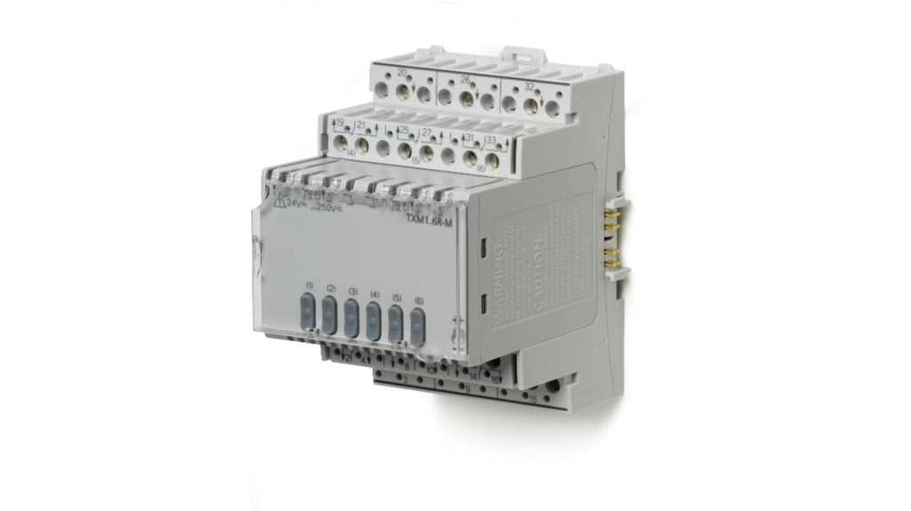 Modulo relè per guida DIN, 6 uscite a relè, tensione di alimentazione 24 V c.c., segnalazione singolo punto I/O con LED di stato verde, LED di stato I/O a tre colori, override locale, formato DIN compatto, base morsettiera separata, sostituzione rapida moduli I/O, compatibile con TX-I/O™, progettato per applicazioni industriali.