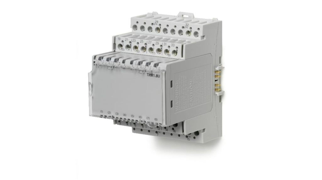 Modulo I/O analogico e digitale, serie TXM1.8U, Siemens. Otto ingressi/uscite configurabili, formato DIN compatto, base morsettiera separata, modulo I/O plug-in. Connessione diretta dispositivi di campo, rapida messa in servizio con isolamento terminali, moduli I/O sostituibili senza ricablaggio. Tensione di alimentazione 24 V c.c., LED di stato e display LCD per diagnostica, etichette bifacciali per identificazione punti I/O.