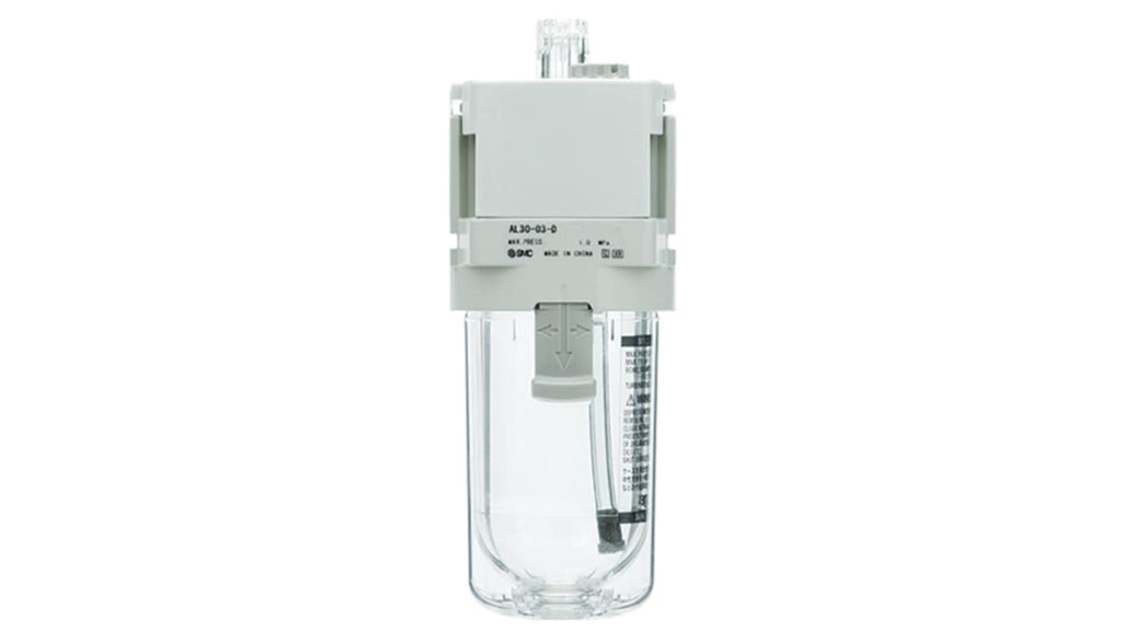 Lubrificatore pneumatico modulare SMC, attacco G 1/4, pressione massima 10 bar, progettato per una lubrificazione precisa con velocità di caduta dell'olio regolabile. Contenitore sottile in resina per maggiore capacità e design compatto. Ideale per componenti a valle, offre migliore operabilità e varietà di opzioni disponibili. Serie AL40.