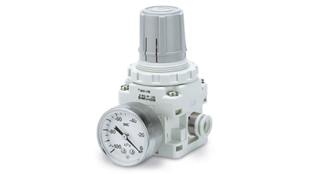 Regolatore di vuoto SMC per il controllo della pressione della linea di vuoto, portata massima 235L/min, massima pressione di vuoto -1.3kPa, minima pressione di vuoto -100kPa, raccordo one-touch incorporato, pressostato digitale per montaggio a pannello, serie IRV20.