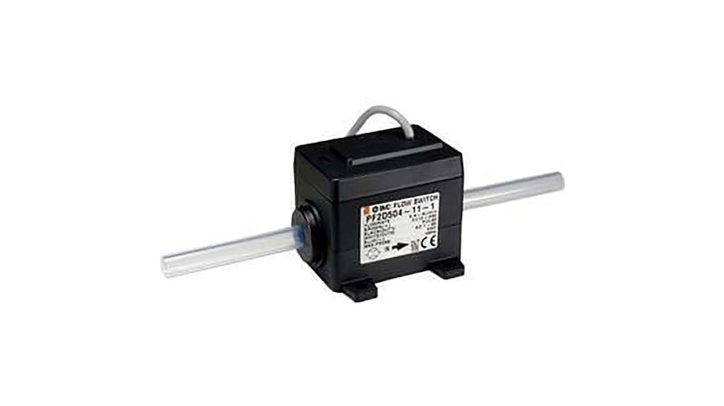 Interruttore di flusso digitale per acqua deionizzata e prodotti chimici, flusso minimo 0,4 l/min, flusso massimo 4 l/min, tensione di alimentazione 12-24 V c.c., raccordo a innesto rapido, pressione massima 1 MPa, materiale PFA, temperatura minima del fluido 0 °C, temperatura massima del fluido 90 °C, corrente nominale 20 mA, serie PF2D, unità sensore di tipo remoto.