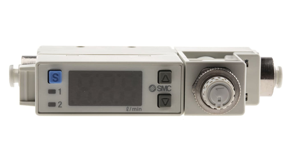 Regolatore di flusso digitale SMC, flusso 0,2 a 10 l/min, uscita di controllo PNP, design compatto, tensione di alimentazione 24 V c.c., display LED, diametro tubo 4 mm, temperatura operativa da 0 a 50 gradi Celsius, ripetibilità 1% F.S. o meno, senza grasso, valvola di regolazione della portata integrata, tempo di risposta impostabile.