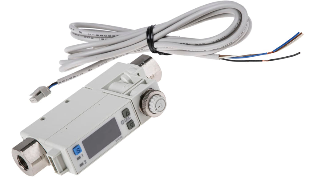 Regolatore di flusso digitale, flusso 1 a 50 l/min, uscita di controllo PNP, design compatto, tensione di alimentazione 24 V c.c., display LED, diametro tubo 1/8 poll, temperatura operativa da 0 a 50 gradi Celsius, ripetibilità 1% F.S. o meno, senza grasso, valvola di regolazione integrata, tempo di risposta impostabile.