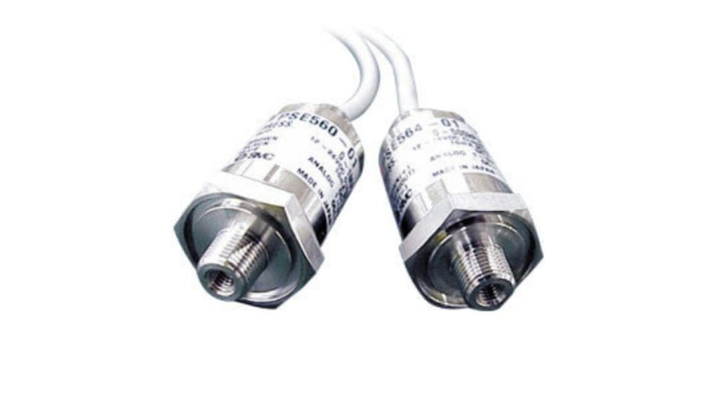 Sensore di pressione SMC, pressione massima 500 kPa, pressione minima 0 kPa, precisione ±1 / ±3%, uscita analogica 1 a 5 V, modello PSE560, fluido applicabile aria, temperatura d'esercizio da -10 a 60 °C.
