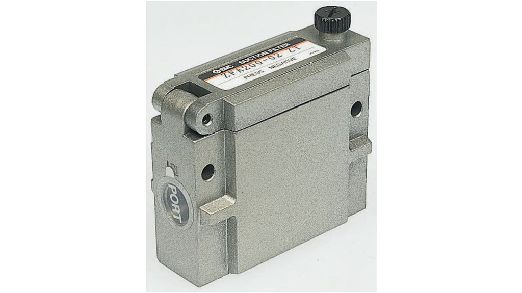 Filtro di vuoto SMC ZFA100-01, grado di filtrazione 30μm, attacco Rc 1/8, portata tipica 50L/min, pressione operativa massima 0,5 MPa, minima temperatura operativa +5°C, massima temperatura operativa +60°C, minima pressione operativa -100kPa, design compatto e ultraleggero, facile sostituzione dei componenti, protegge l'apparecchiatura a vuoto da colpi di pressione positiva inversa.