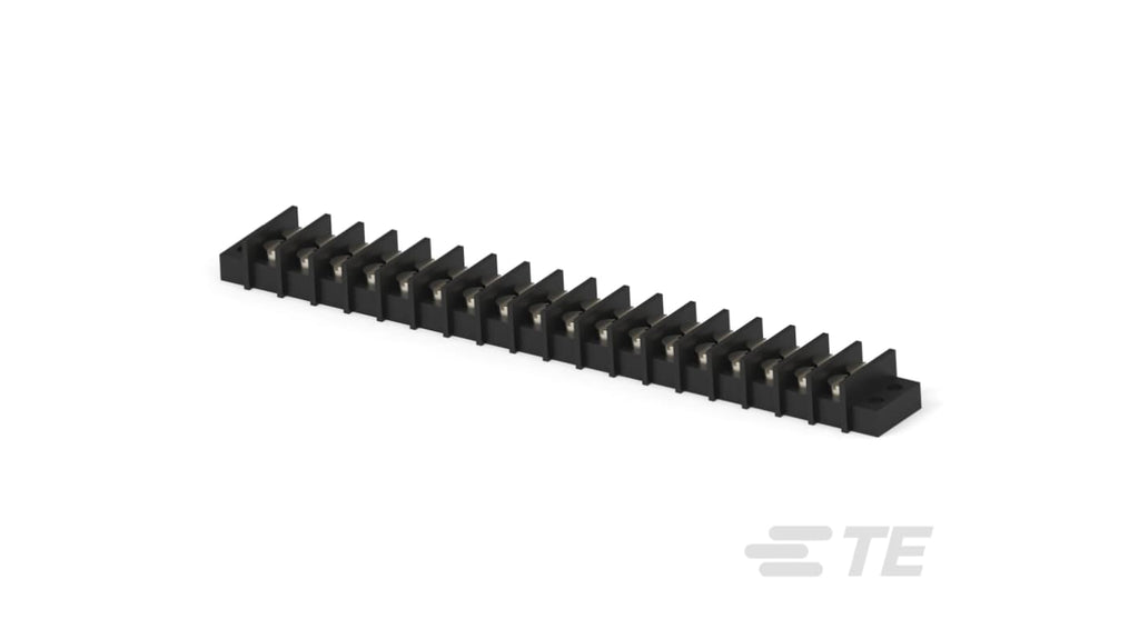 Barretta a 18 contatti, passo 9.53 mm, orientamento verticale, progettata per connettività di potenza. Corrente nominale 20 A, tensione nominale 300 V. Materiale contatto in ottone con placcatura in stagno. Design a doppia barriera per maggiore sicurezza, alloggiamento termoplastico resistente, viti nichelate per connessioni robuste. Classificazione di infiammabilità UL 94V 0, basso contenuto di alogeni per conformità ambientale. Codice costruttore 1-1546306-8, marchio TE Connectivity.