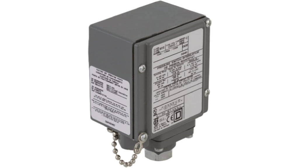 Pressostato differenziale Telemecanique Sensors, azionamento a membrana, pressione massima 90psi, pressione minima 16psi, precisione 0,1 a 1%, fluido misurato gas e livello liquido, collegamento al processo NPT 1/4, collegamento elettrico NPT 12, corrente massima 10 A, tensione di alimentazione 600 V, custodia in acciaio zincato, temperatura operativa da -40 a +120 gradi. Codice costruttore 9012GBW1.