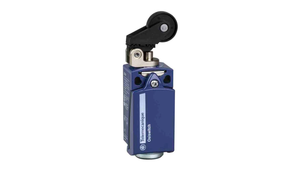Interruttore di fine corsa con leva a rullo, 1NC/1NA, 500V, 10A, grado di protezione IP66 e IP67, conforme a IEC 60529. Attuatore in metallo, progettato per impieghi medi. Configurazione DP, materiale custodia in metallo.
