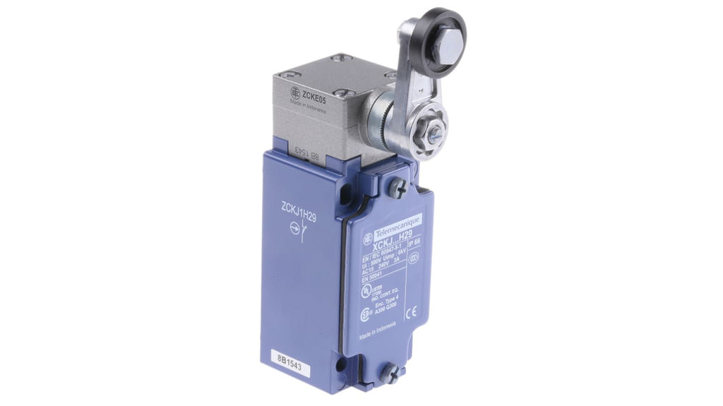 Interruttore di fine corsa Telemecanique, leva, configurazione NO/NC, tensione massima 240V, corrente massima 10A, grado di protezione IP66, azione rapida, durata meccanica 30000000 cicli, temperatura operativa da -25 a +70 gradi Celsius, corpo in lega di zinco, dimensioni 77mm x 40mm x 44mm, conforme a UL e CSA. Codice costruttore XCKJ10511H29.