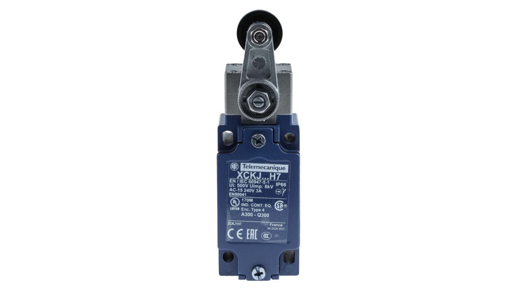 Interruttore di fine corsa con leva a rullo, configurazione NO/NC, tensione massima 500V, corrente massima 10A, grado di protezione IP66. Materiale custodia in lega di zinco zamak, azione rapida, durata meccanica 30000000 cicli. Dimensioni 77mm x 40mm x 44mm, temperatura operativa da -25°C a +70°C, orientamento di montaggio laterale, tipo di connessione 1/2 in NPT. Codice costruttore XCKJ10511H7, marchio Telemecanique Sensors.