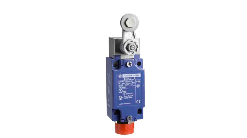 Interruttore di fine corsa con leva a rullo, 1NC/1NA, tensione massima 300V, corrente massima 6A, grado di protezione IP66, grado di protezione IK07, custodia in metallo, azione rapida, conforme a IEC 60529 e EN 50102. Codice costruttore XCKJ10513A, marchio Telemecanique Sensors.