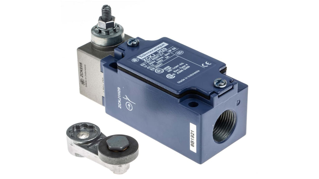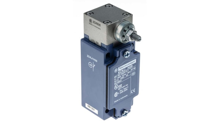 Interruttore di fine corsa Telemecanique, leva, configurazione NO/NC, tensione massima 240V, corrente massima 10A, grado di protezione IP66. Tipo di attuatore rullo con ritorno a molla, azione rapida, corpo in lega di zinco, dimensioni 40mm x 77mm x 44mm, temperatura operativa da -25°C a +70°C, durata meccanica 30000000 cicli. Codice costruttore XCKJ10513H29.