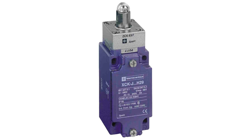 Interruttore di fine corsa Telemecanique Sensors, tasto a rotella, configurazione 1NC/1NA, corrente massima 10A, tensione 500V, grado di protezione IP66, materiale custodia in lega di zinco zamak, impieghi pesanti, conforme a IEC 60529 e EN 50102, grado di protezione IK07. Codice costruttore XCKJ567H29.