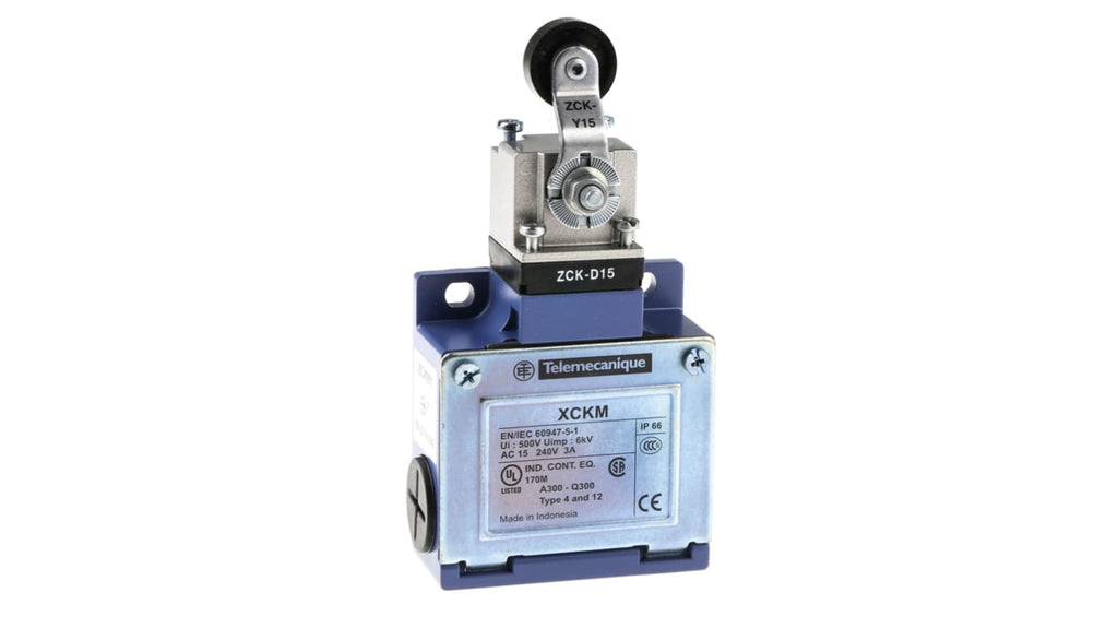 Interruttore di fine corsa Telemecanique, leva, NO/NC, 240V, 10A, IP66. Tipo di attuatore: leva con rotella, azione rapida, corpo in lega di zinco, dimensioni 64mm x 64mm x 30mm, temperatura operativa da -25°C a +70°C, durata meccanica 15000000 cicli. Standard IEC 947-5-1, NFC 63146, VDE 0660-200, UL 508. Codice costruttore: XCKM115.