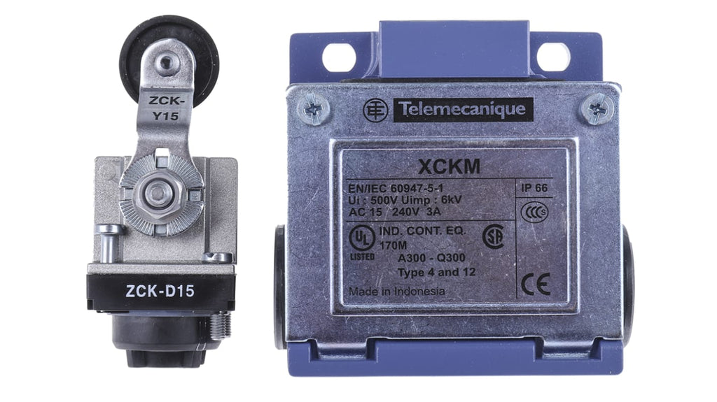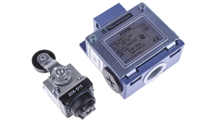 Interruttore di fine corsa con leva, configurazione NO/NC, tensione massima 240V, corrente massima 10A, grado di protezione IP66. Realizzato in lega di zinco, azione rapida, durata meccanica 15000000 cicli. Dimensioni 64mm x 63mm x 30mm, temperatura operativa da -25°C a +70°C. Conforme a standard VDE0660, IEC947-5-1, UL, CSA. Codice costruttore XCKM115H29, serie OsiSense XC.