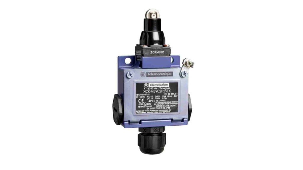 Interruttore di fine corsa con tasto a rotella, 2NC/1NA, 400V, 6A, grado di protezione IP66 conforme a IEC 60529, attuatore di tipo meccanico, azione rapida, custodia in metallo, configurazione 3 poli, progettato per applicazioni di impieghi medi. Codice costruttore: XCKM3902H29EX, marchio Telemecanique Sensors.