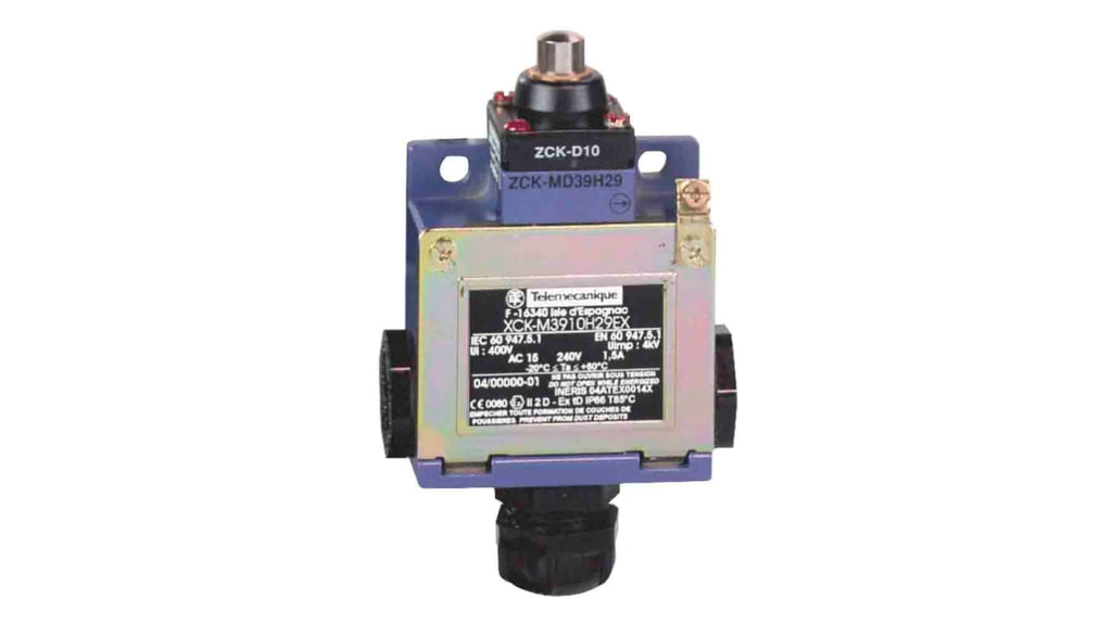 Interruttore di fine corsa con stantuffo, 2NC/1NA, 400V, 6A, grado di protezione IP66, conforme a IEC 60529, azione rapida, custodia in metallo. Configurazione polo e corsa 3P, progettato per impieghi medi.