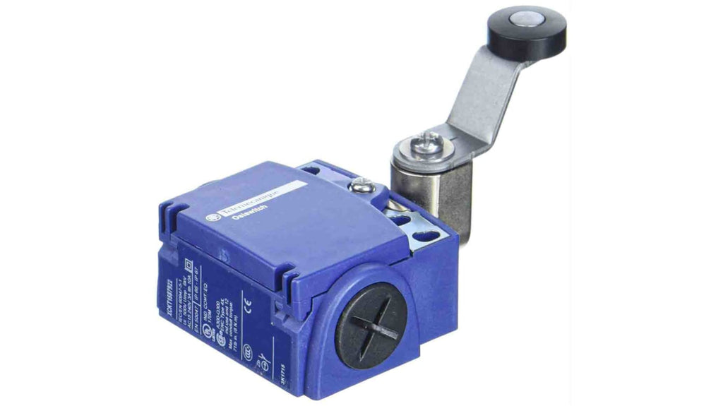 Interruttore di fine corsa a pistone a rotella, 1NC/1NA, 240V, 10A, protezione IP66/IP67, azione rapida, durata meccanica 10000000 cicli, temperatura operativa da -25°C a +70°C, custodia in plastica, tipo di connessione 1/2 in NPT, serie XCKT. Codice costruttore: XCKT1587922. Marchio: Telemecanique Sensors.