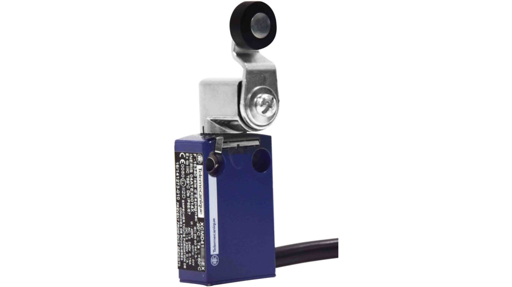 Interruttore di fine corsa con attuatore a rullo, configurazione 2NA e 2NC, corrente massima 6A, protezione IP66 e IP67, custodia in metallo, azione rapida. Conforme alla norma IEC 60947-5-1, elevata precisione di ripetitività, alta resistenza alle condizioni ambientali industriali. Certificazioni UL, CSA, CCC. Codice costruttore: XCMD4115L5EX, marchio Telemecanique Sensors.